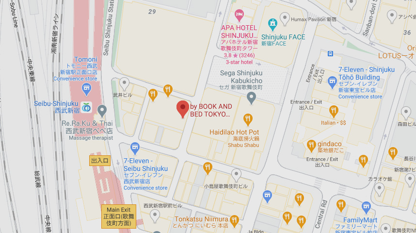 BOOK AND BED TOKYO SHINJYUKU 〒160−0021 東京都新宿区歌舞伎町1−27−5 歌舞伎町APMビル8階 (各新宿駅 徒歩約8分・西武新宿駅南口 徒歩約1分)